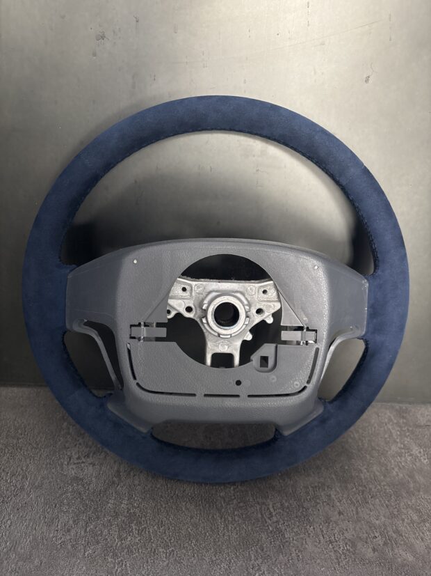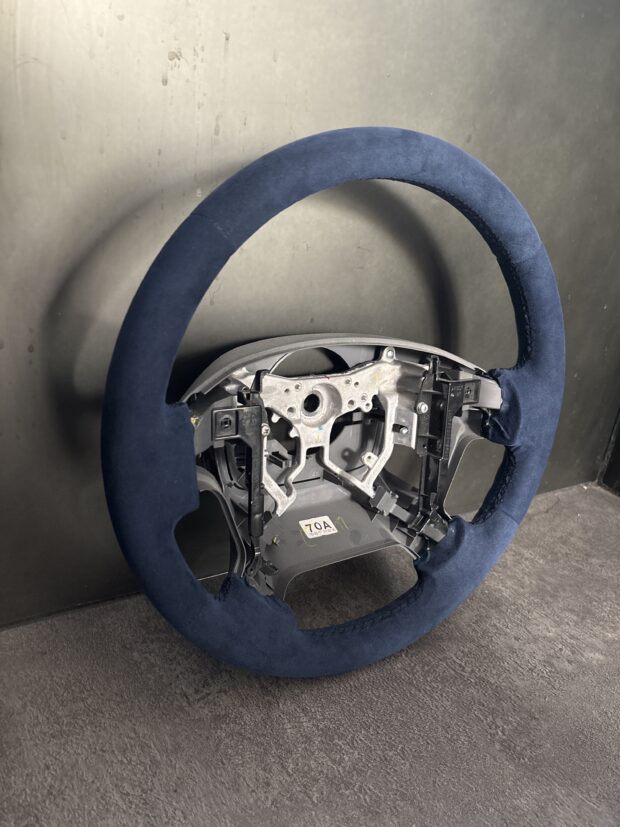 青のアルカンターラを使いステッチも青で仕上げることにより、ステアリングに一体感をもたらしました。