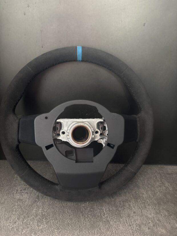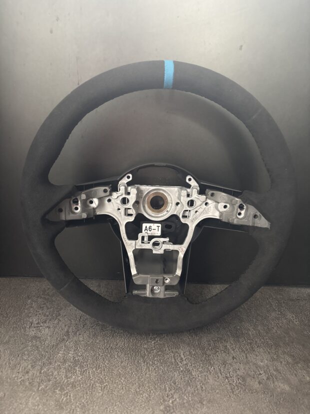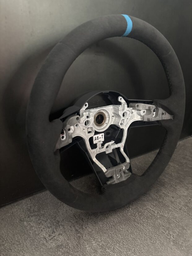 黒のアルカンターラと黒ステッチでまとめた一本に差し色の青のセンターマークが追加され、お洒落な一本に仕上がりました。