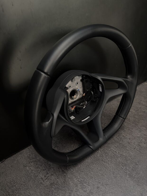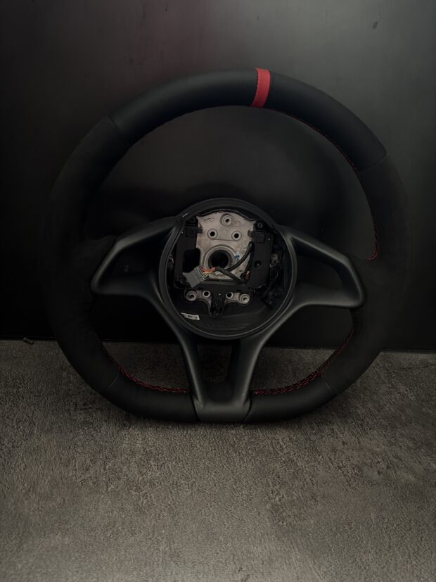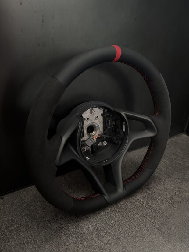 アルカンターラと本革のコンビネーションに加え、差し色としてセンターマークとステッチを赤でまとめました。